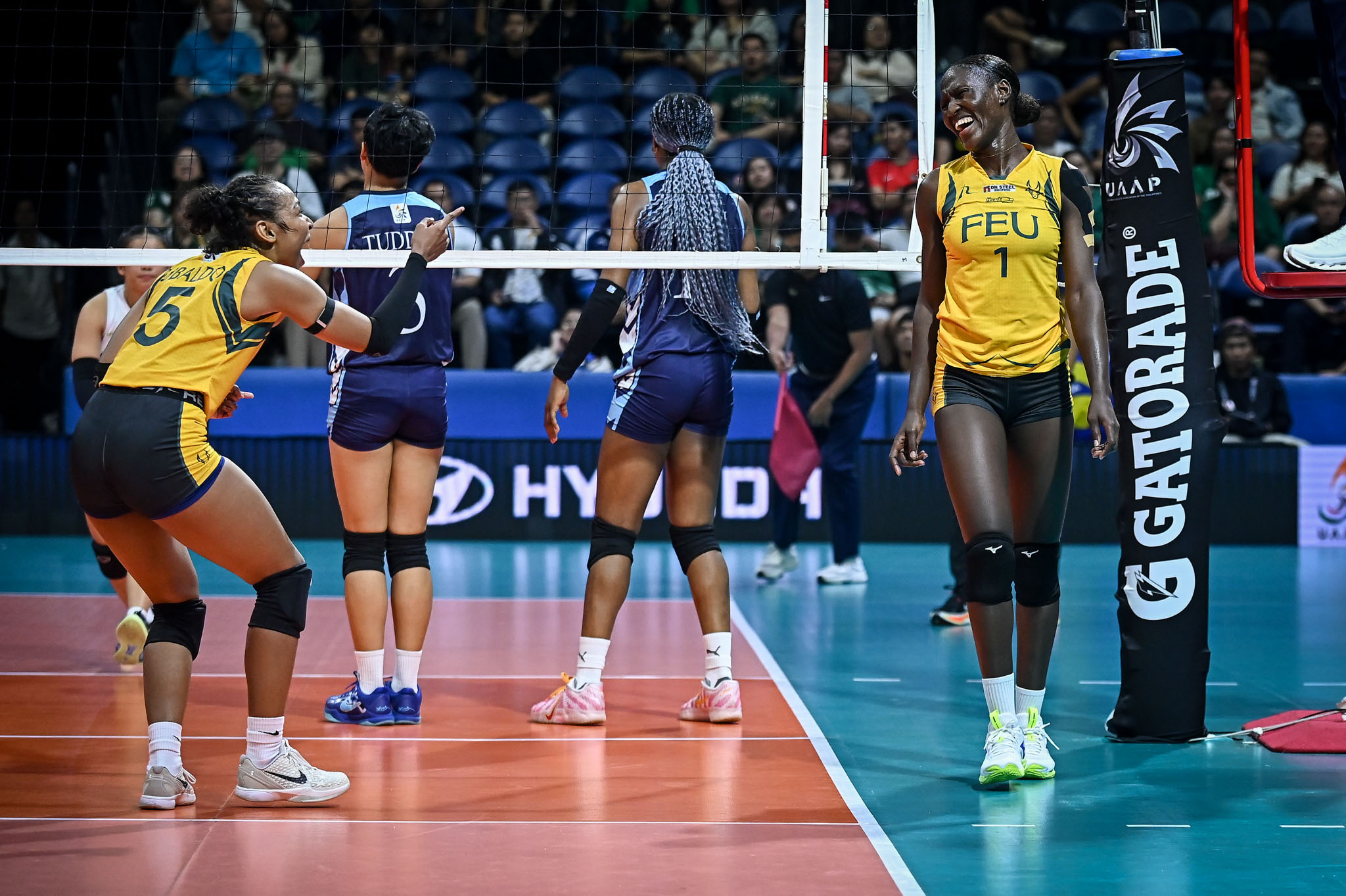 FEU used a stirring 4-0 run to shatter a 17-17 deadlock in the fourth set. Shain Nitura tried to keep the Falcons in the game scoring her team’s last three points, including a kill to save a match point.