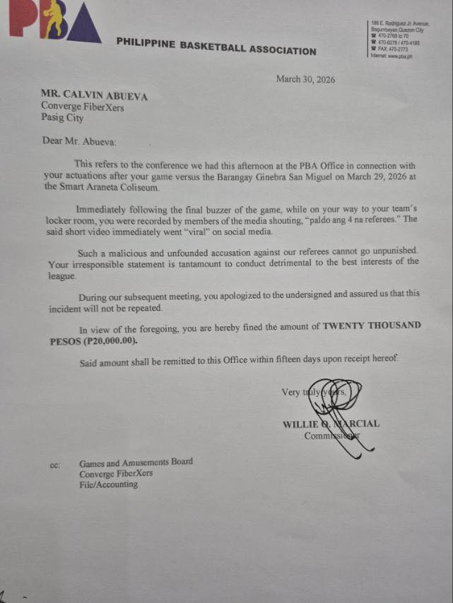 The Philippine Basketball Association (PBA) Commissioner's Office has fined Calvin Abueva P20,000 for his remarks about officiating after Converge's game against Barangay Ginebra on Sunday at the Smart-Araneta Coliseum.